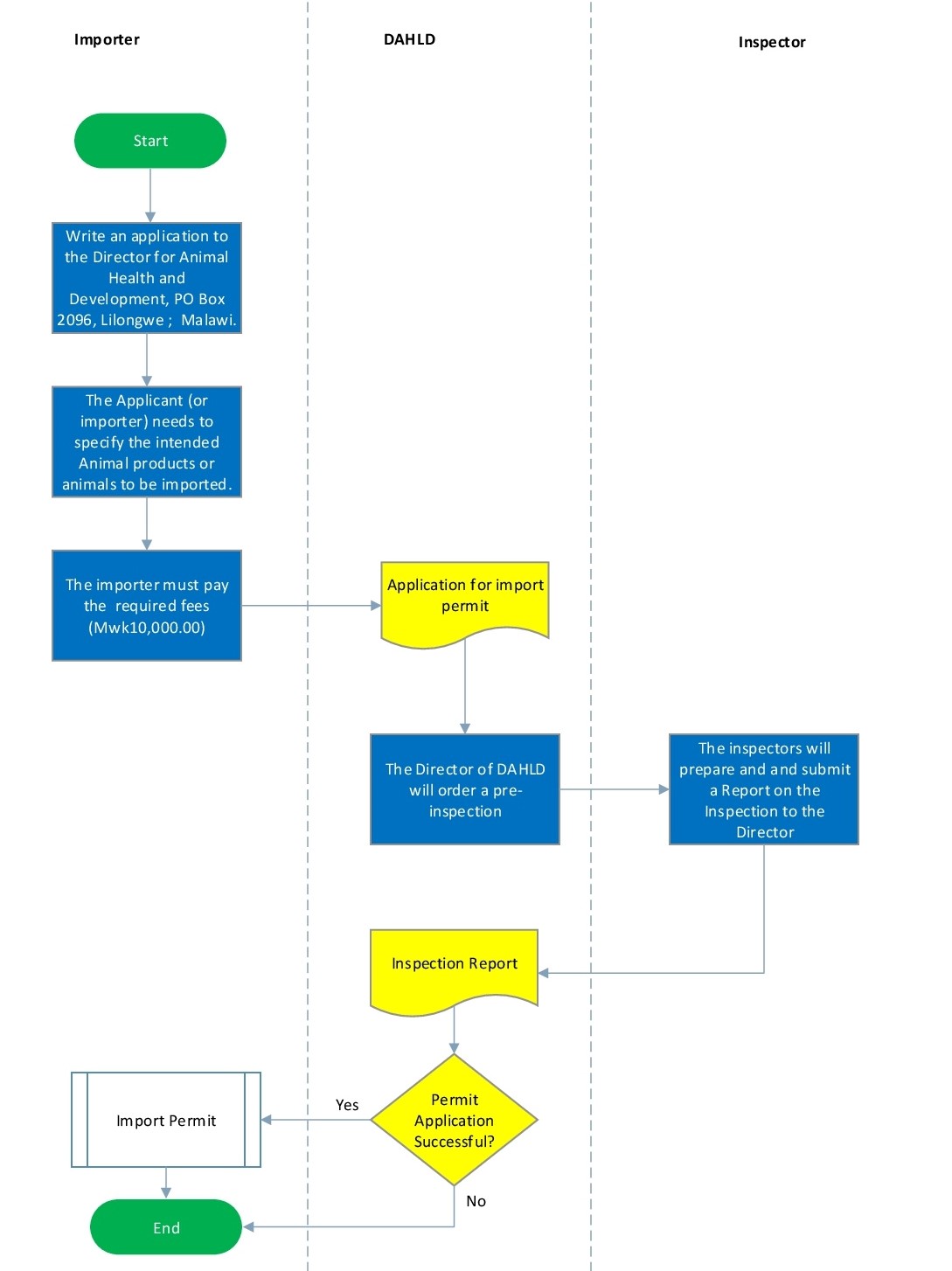 | 3 | The importer must pay the required fees (Mwk10,000.00). | |