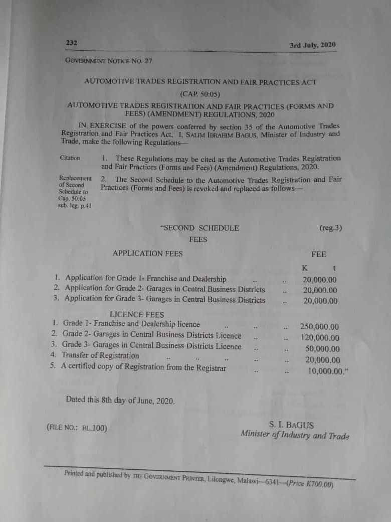 The revision is in the Malawi Gazette Supplement, dated 3rd July, 2020.
